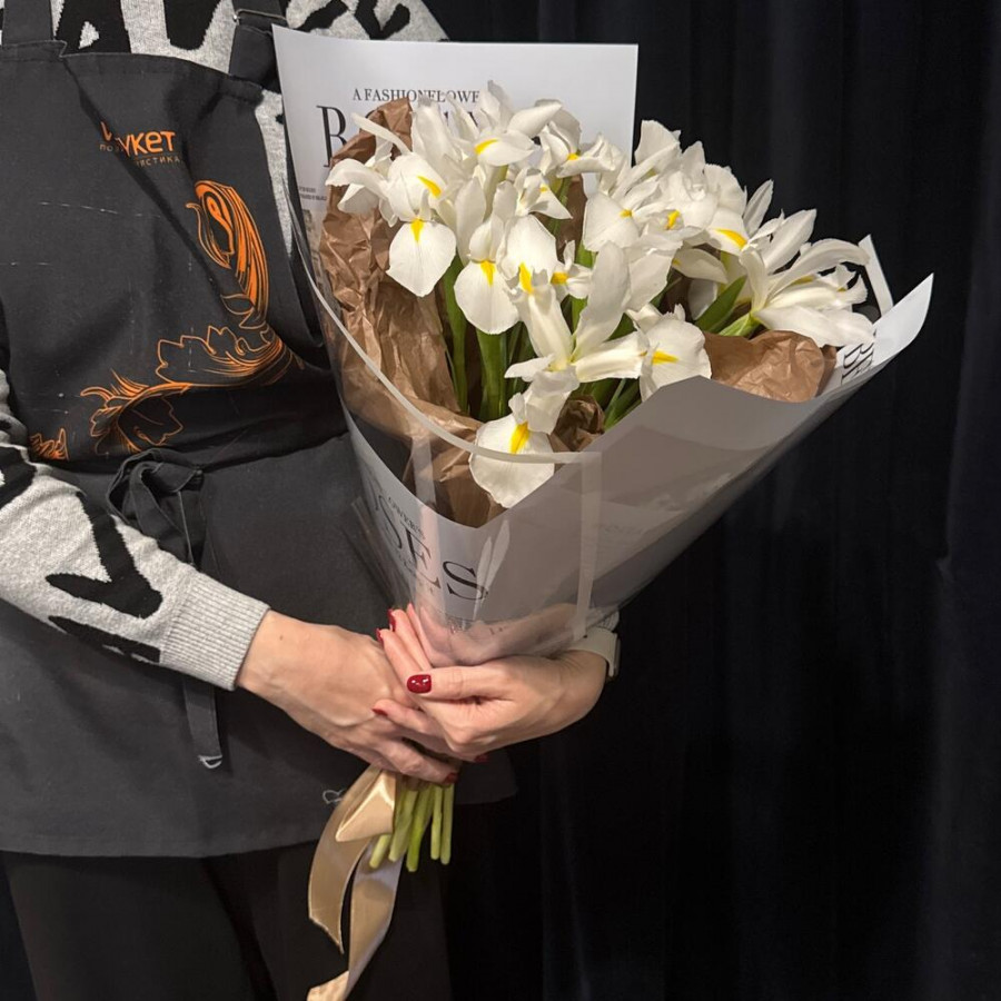 На фото букет из 11 белых ирисов. В составе: ирис 11 шт, дизайнерская упаковка 1 шт, атласная лента 1 шт, . Все цветы свежие и ароматные, букет красиво оформлен и отлично подходит для подарка. Доступна доставка цветов или самовывоз.