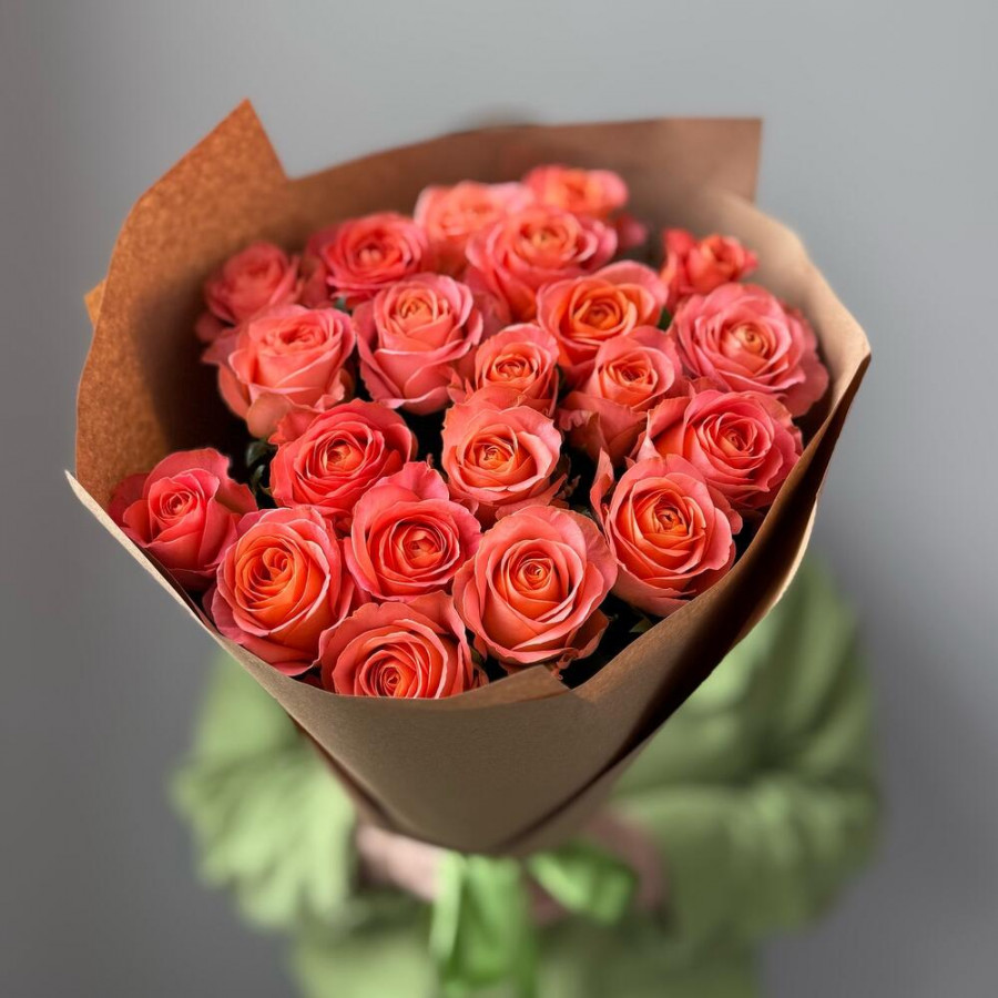 На фото букет из 21 оранжевой розы. В составе: роза 21 шт, крафт-бумага 2 шт, атласная лента 1 шт, . Все цветы свежие и ароматные, букет красиво оформлен и отлично подходит для подарка. Доступна доставка цветов или самовывоз.
