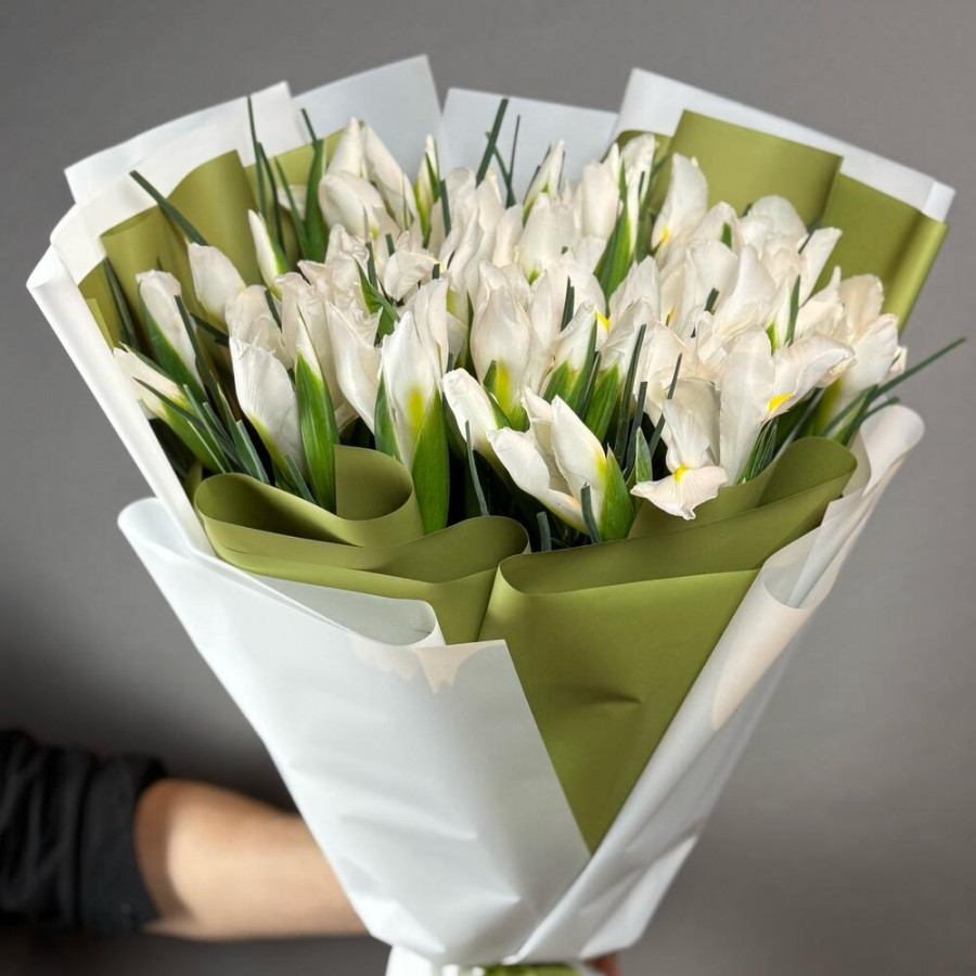 Лента атласная - 1 шт. Пленка дизайнерская - 1 шт. открыточка - 1 шт. ирисы белые - 39 шт.