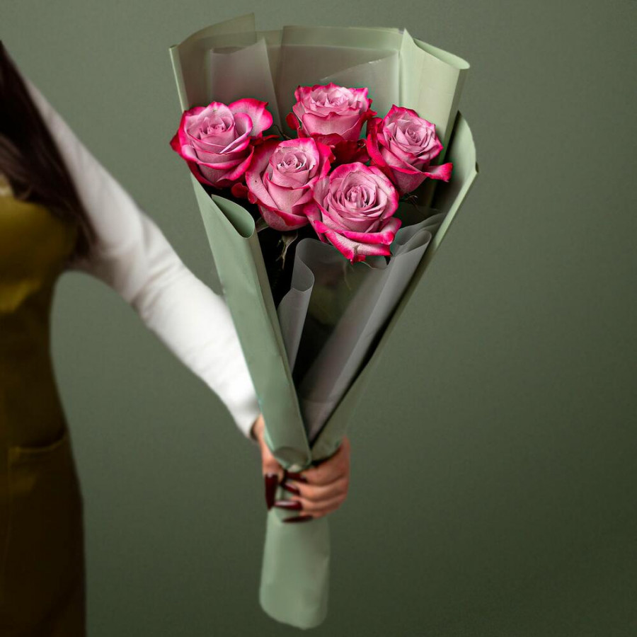 На фото букет из 5 фиолетовых роз. В составе: роза 5 шт, дизайнерская упаковка 1 шт, атласная лента 1 шт, . Все цветы свежие и ароматные, букет красиво оформлен и отлично подходит для подарка. Доступна доставка цветов или самовывоз.