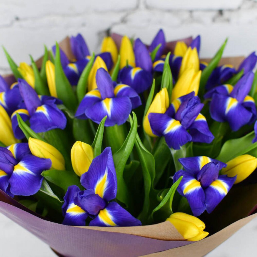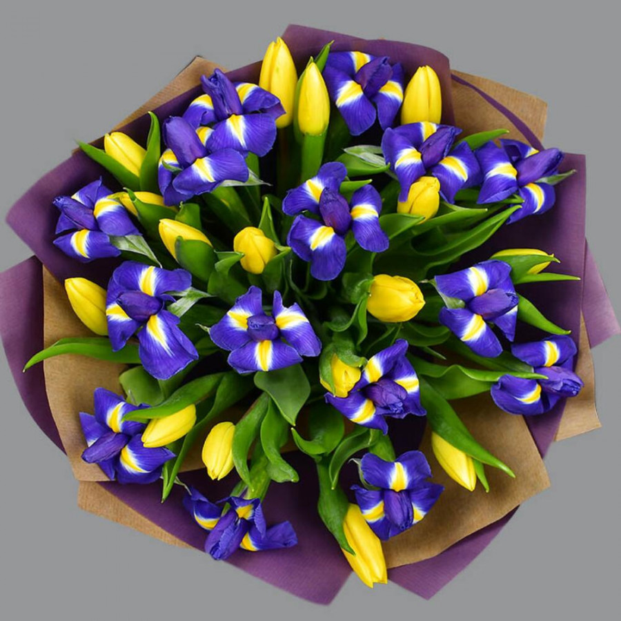 На фото букет из синих ирисов и желтых тюльпанов. В составе: ирис 15 шт, тюльпан 16 шт, крафт-бумага 1 шт, атласная лента 1 шт, . Все цветы свежие и ароматные, букет красиво оформлен и отлично подходит для подарка. Доступна доставка цветов или самовывоз.