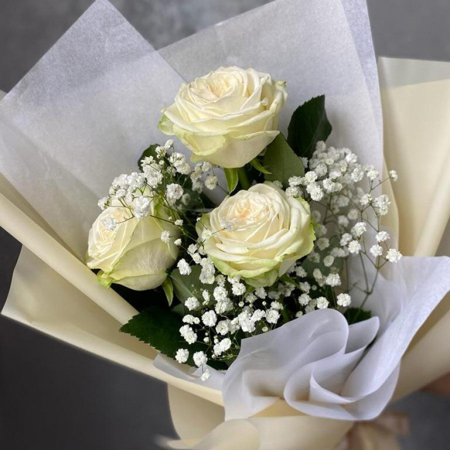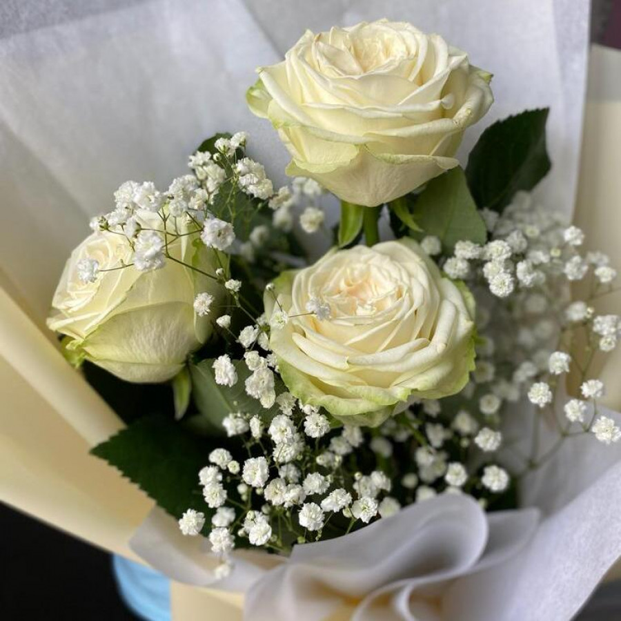 Букет из 3 белых роз c гипсофилой в Елизово