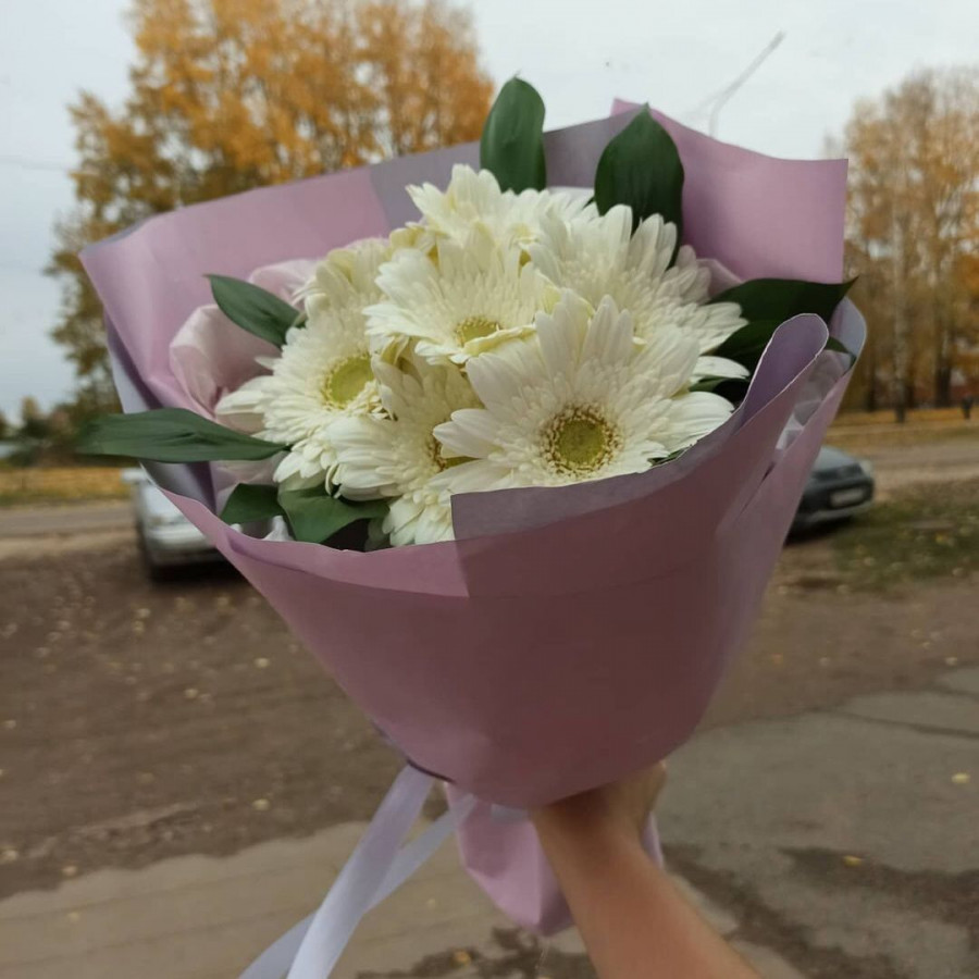 На фото букет из 7 белых гербер. В составе: гербера 7 шт, аспидистра 2 шт, крафт-бумага 1 шт, атласная лента 1 шт, . Все цветы свежие и ароматные, букет красиво оформлен и отлично подходит для подарка. Доступна доставка цветов или самовывоз.