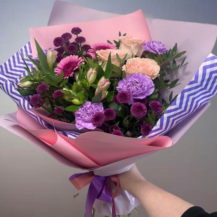 На фото букет из гвоздики и альстромерии. В составе: альстромерия 4 шт, гвоздика 3 шт, гербера 3 шт, роза 3 шт, хризантема кустовая 2 шт, крафт-бумага 1 шт, атласная лента 1 шт, . Все цветы свежие и ароматные, букет красиво оформлен и отлично подходит для подарка. Доступна доставка цветов или самовывоз.