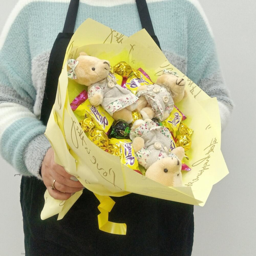 Лента атласная - 1 шт. Упаковка дизайнерская - 2 шт. Медведь плюшевый - 3 шт. Конфеты марсианка - 3 шт. конфеты озера - 4 шт. конфеты ярче - 6 шт.