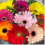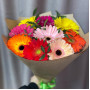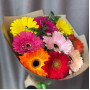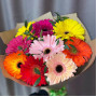 На фото букет из разноцветных гербер. В составе: гербера 9 шт, писташ 2 шт, крафт-бумага 1 шт, атласная лента 1 шт, . Все цветы свежие и ароматные, букет красиво оформлен и отлично подходит для подарка. Доступна доставка цветов или самовывоз.