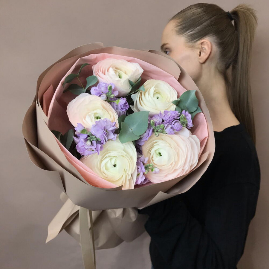 Букет из розовых ранункулюсов и сиреневой матиолы в Елизово