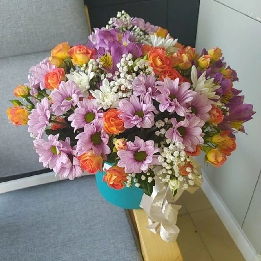 Яркая сборная композиция в круглой, шляпной коробке - бирюзового цвета из оранжевых кустовых роз, нежной розовой кустовой хризантемы и белой гипсофилы