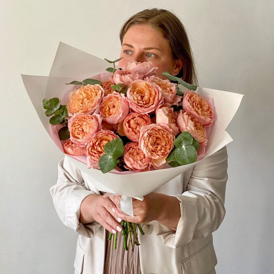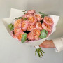 На фото монобукет из кустовой пиновидной розы. В составе: кустовая пионовидная роза 15 шт, крафт-бумага 1 шт, атласная лента 1 шт, . Все цветы свежие и ароматные, букет красиво оформлен и отлично подходит для подарка. Доступна доставка цветов или самовывоз.