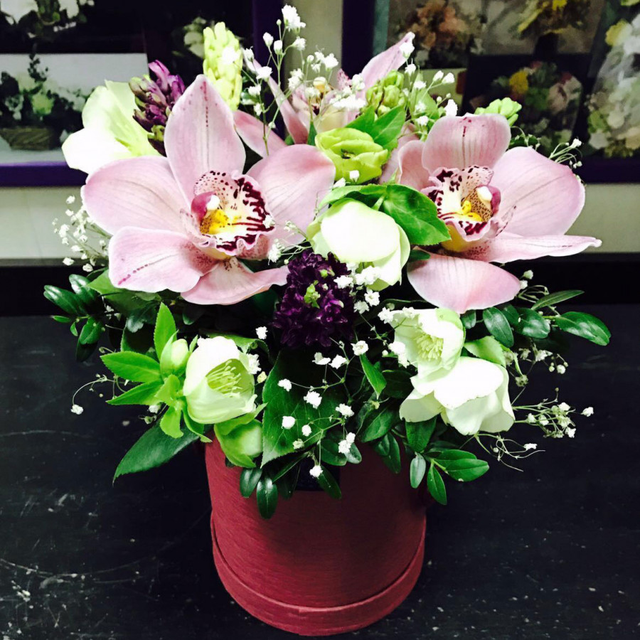 Орхидеи и альстромерии в шляпной коробке в Елизово