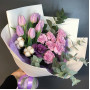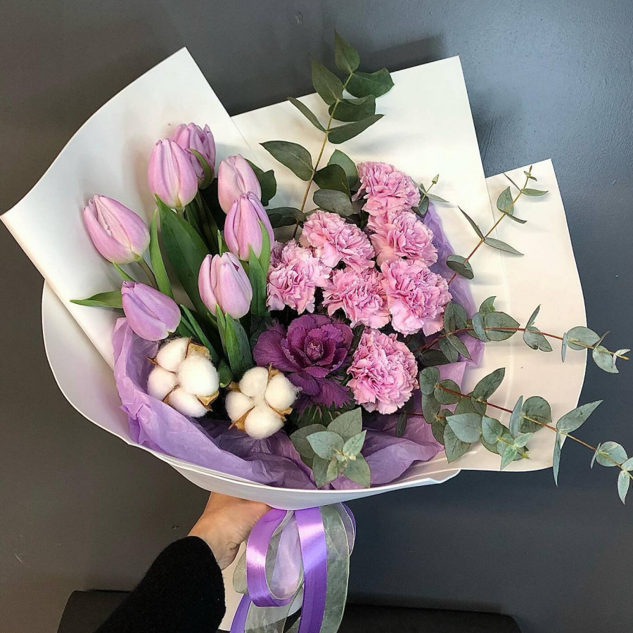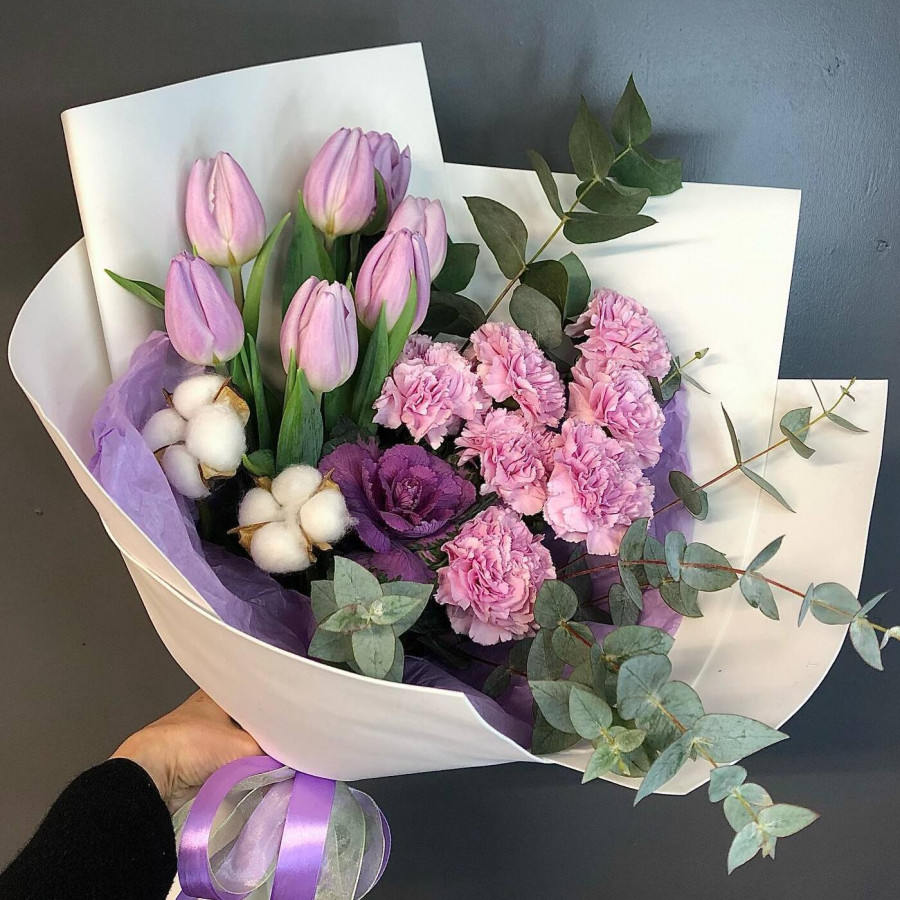 На фото тюльпаны с хлопком. В составе: тюльпан 7 шт, хлопок 2 шт, гвоздика 7 шт, брасика 1 шт, эвкалипт 2 шт, крафт-бумага 1 шт, . Все цветы свежие и ароматные, букет красиво оформлен и отлично подходит для подарка. Доступна доставка цветов или самовывоз.